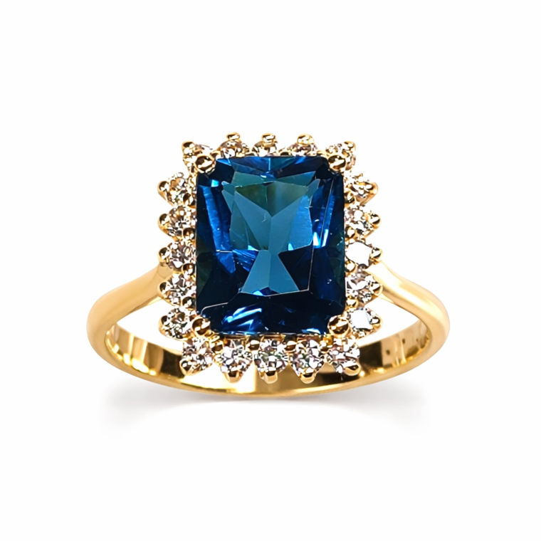 Δαχτυλίδι σε σχήμα ροζέτας από κίτρινο χρυσό με ορθογώνιο αληθινό Ζαφείρι και Μπριγιάν