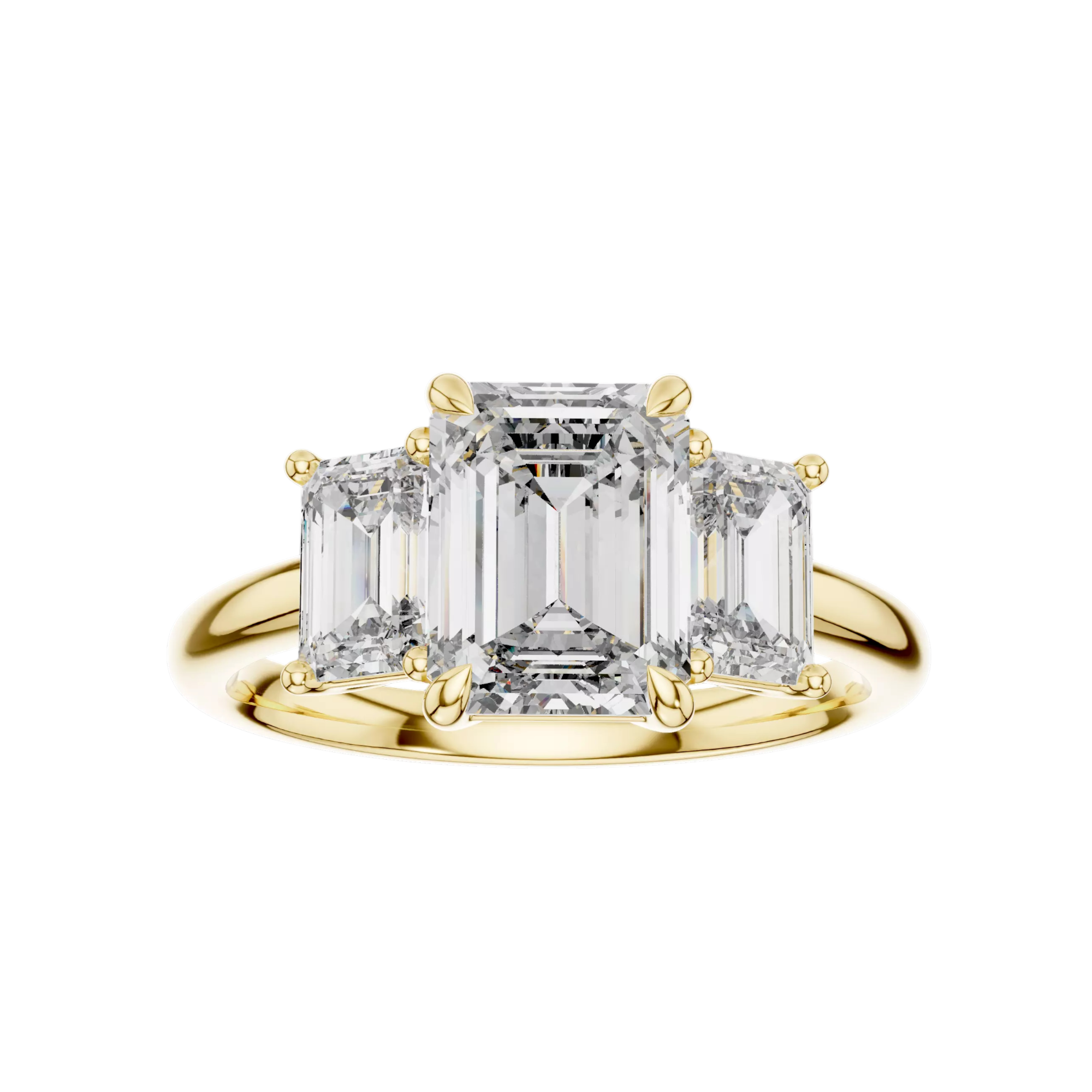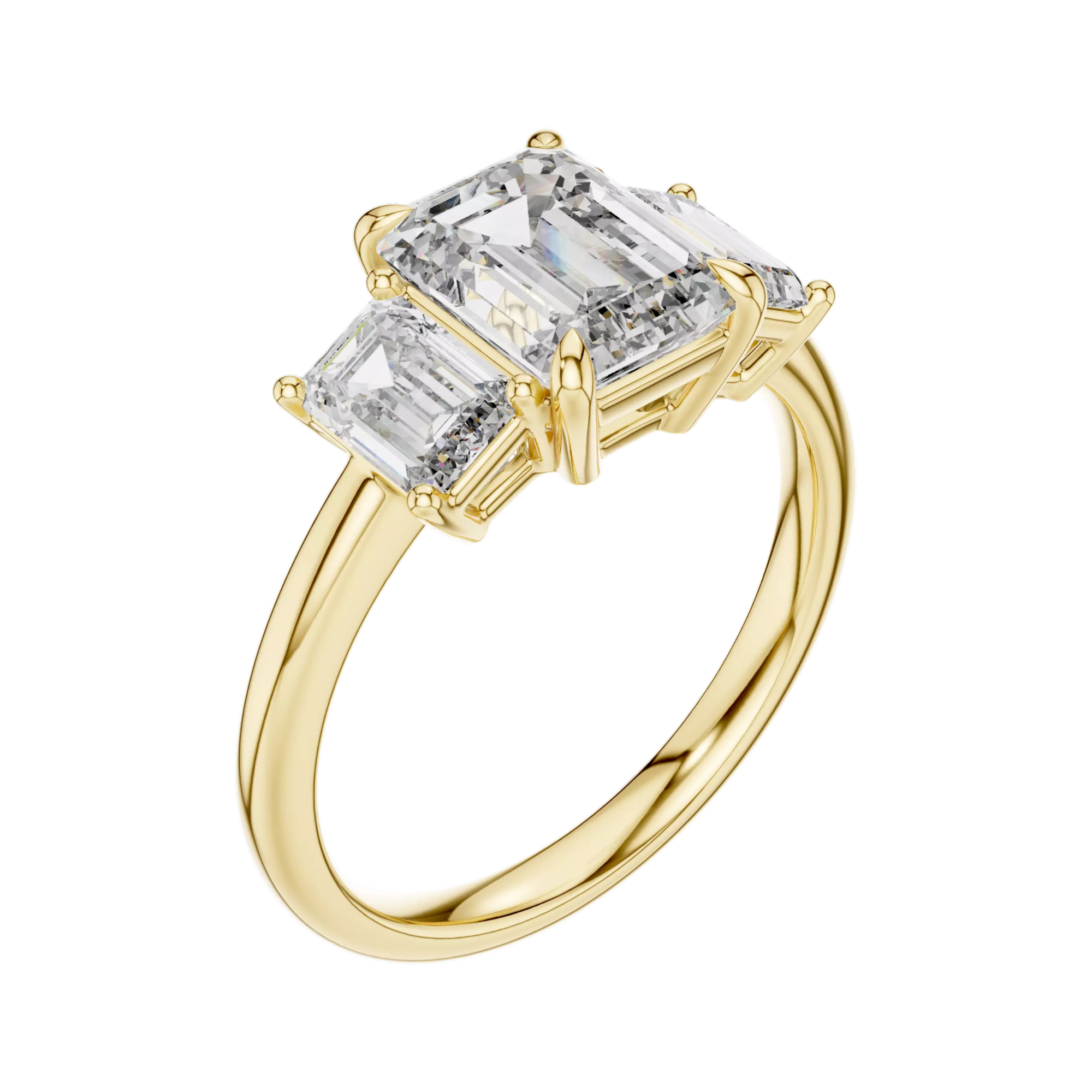 Ένα εκλεπτυσμένο δαχτυλίδι τριών λίθων που αποπνέει διαχρονική πολυτέλεια. Στο κέντρο δεσπόζει ένα εντυπωσιακό emerald cut lab grown διαμάντι, πλαισιωμένο από δύο πλαϊνά διαμάντια ίδιου κοψίματος που ενισχύουν τη λάμψη και τη συμμετρία του σχεδίου ποιότητας VVS συνολικού βάρους 3,2 καρατιών. Η προσεγμένη βάση αναδεικνύει τις καθαρές γραμμές των πετρών, ενώ η γυαλιστερή χρυσή γάμπα προσφέρει κομψότητα και άνεση στην εφαρμογή. Μια ιδανική επιλογή για πρόταση γάμου ή για μια ξεχωριστή στιγμή που αξίζει να μείνει αξέχαστη.