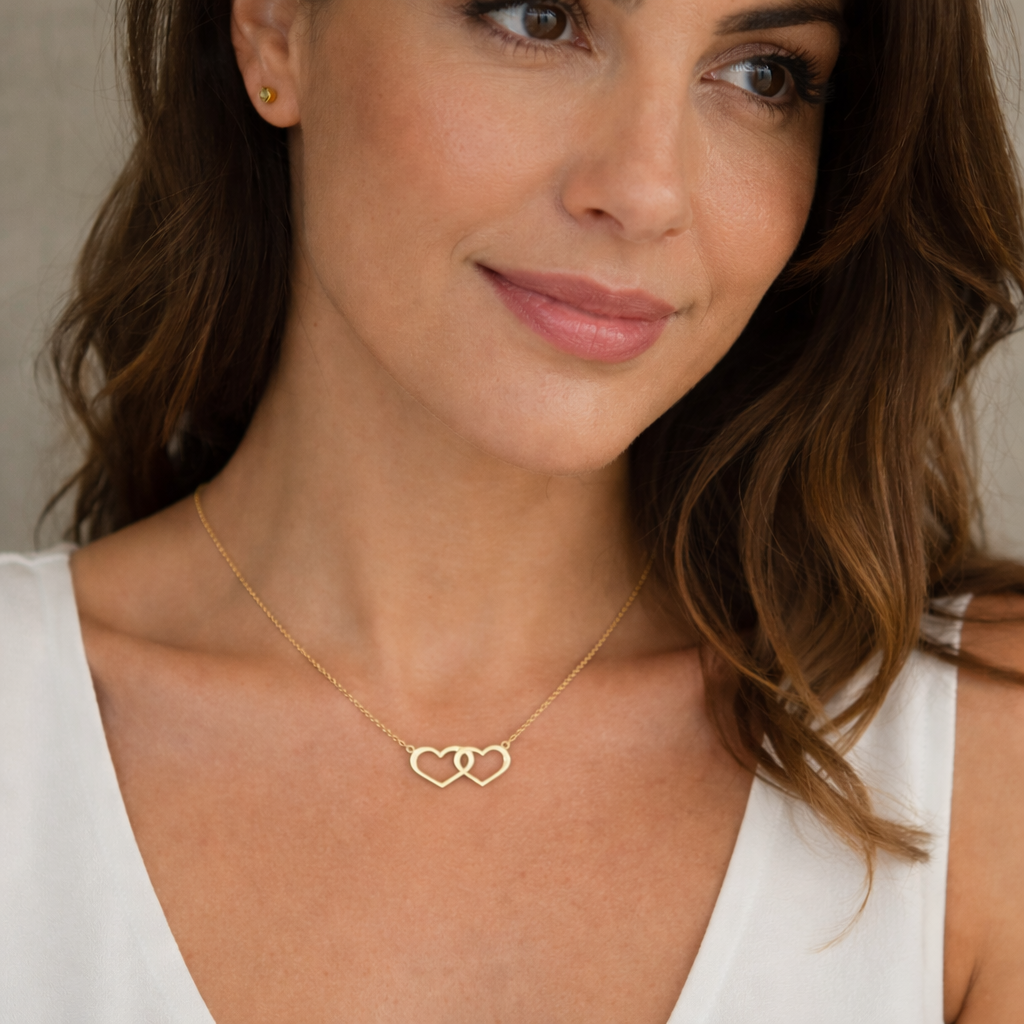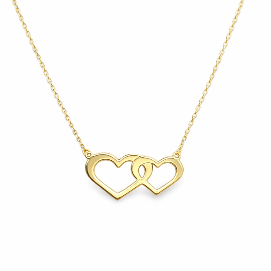 Κομψό χρυσό κολιέ με σχέδιο δύο αλληλένδετων καρδιών, που συμβολίζουν την αγάπη, την ένωση και τον άρρηκτο δεσμό μεταξύ δύο ανθρώπων. Κατασκευασμένο με προσοχή στη λεπτομέρεια και φινίρισμα υψηλής ποιότητας, προσφέρει διαχρονική λάμψη και διακριτική πολυτέλεια. Φοριέται άνετα μόνο του ή σε συνδυασμό με άλλα κοσμήματα και αποτελεί ιδανική επιλογή για δώρο σε αγαπημένο πρόσωπο, επετείους, γενέθλια ή ξεχωριστές στιγμές.
